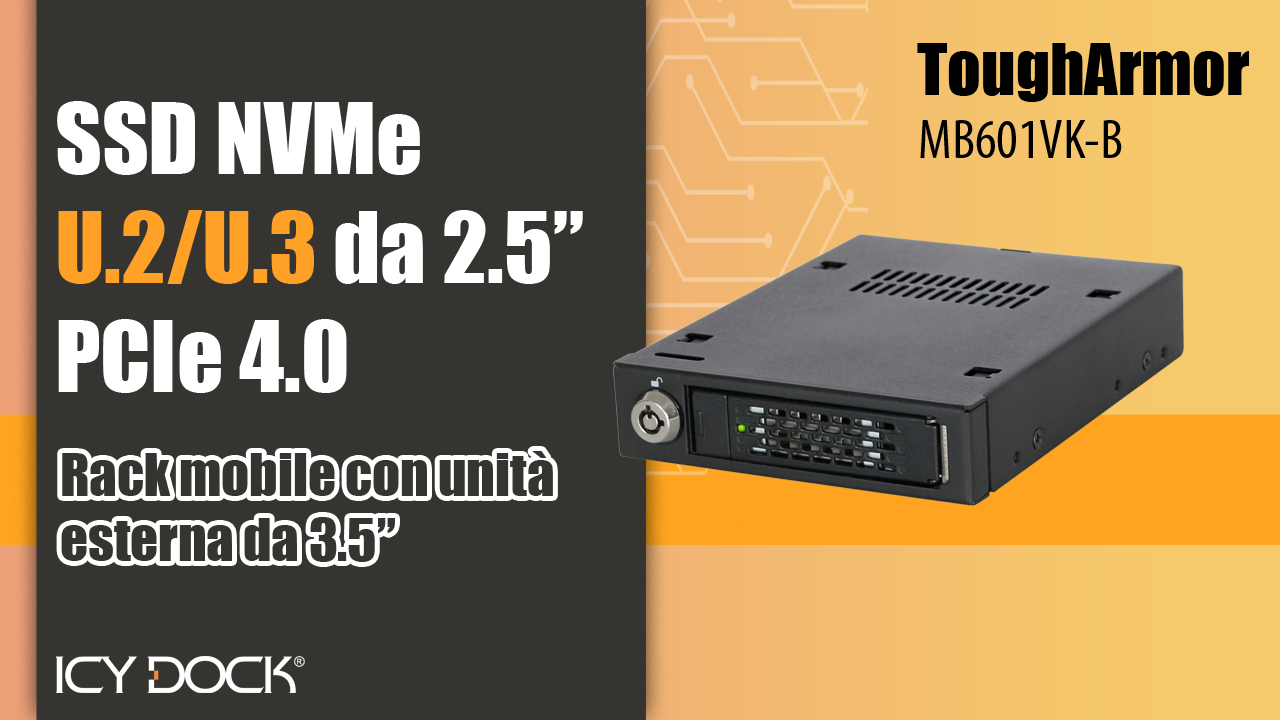 | MB601V4KW-B | 1 x U.2/U.3 NVMe SSD (15mm) PCIe 4.0 Mobile Rack con ToughCover (1 x SFF-8639) | Produzione su ordinazione | |