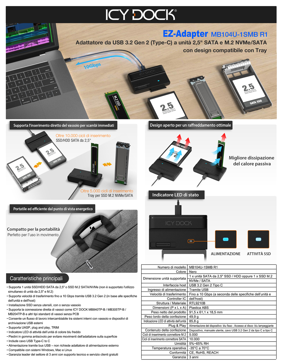 Inoltre, questo adattatore supporta l’accesso diretto ai tray SSD provenienti da varie soluzioni rimovibili ICY DOCK, inclusi: MB840M2P-B, MB840M5P-B, MB842MP-B, MB842M5P-B, MB852M2PO-B, MB872MP-B, MB873MP-B. Con il MB104U-1SMB R1, gli utenti possono leggere istantaneamente i dati da questi moduli SSD su tray tramite qualsiasi computer o workstation dotata di USB — senza reinstallare o rimuovere l’SSD.
