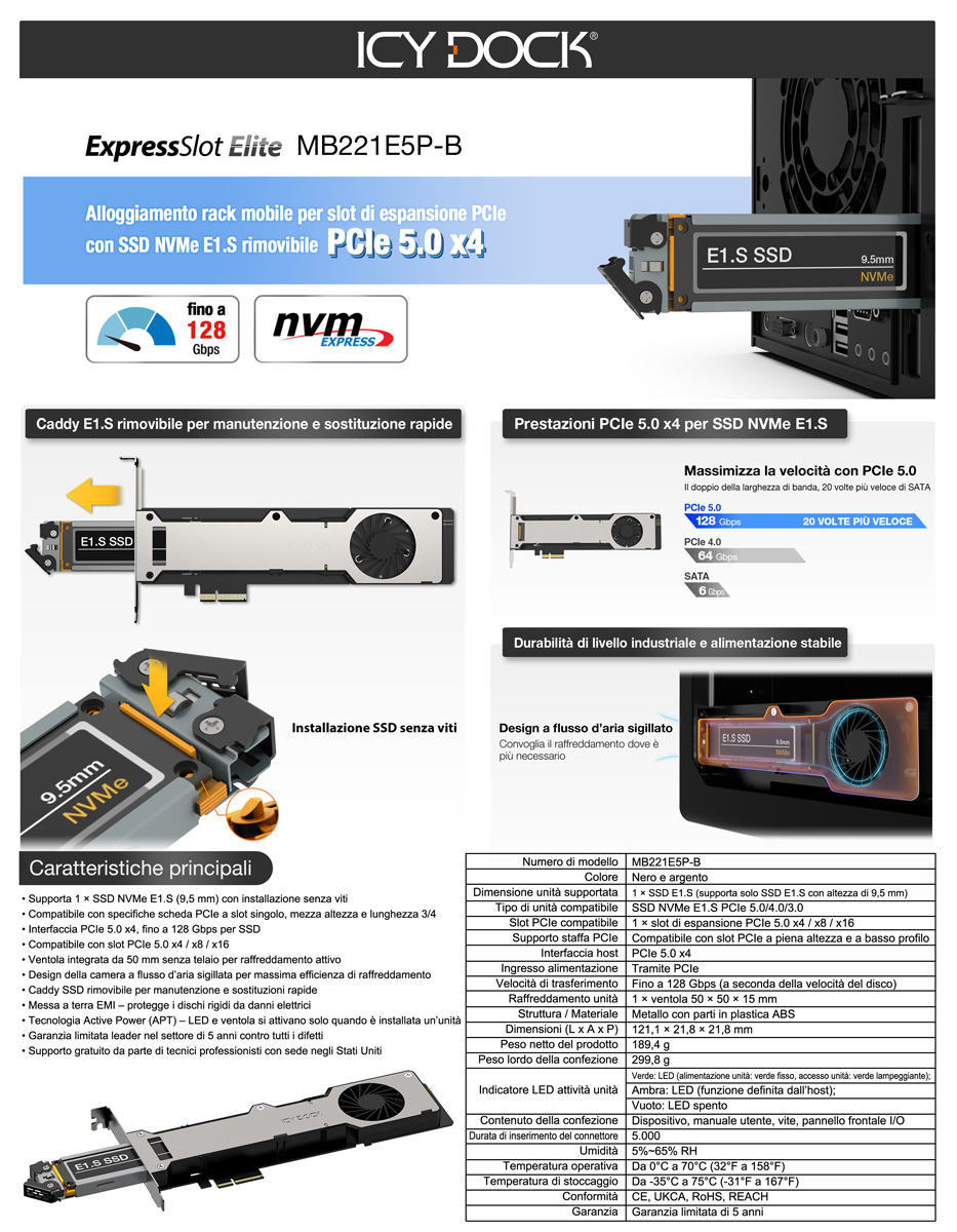 | Dimensione unità supportata: | 1 x SSD E1.S (supporta solo SSD E1.S con altezza di 9.5mm) |