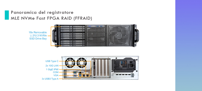 Integrando MB118VP-B (x6-bay) oppure MB699VP-B V3 (x4-bay), il Registratore NVMe FFRAID di MLE ha raggiunto: