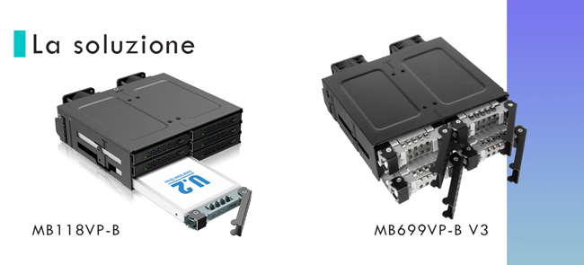 Le gabbie ICY DOCK U.2/U.3 (MB118VP-B e MB699VP-B V3) ci consentono di combinare liberamente qualsiasi mainboard con SSD ad alte prestazioni sostituibili."