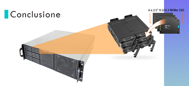 "Gli enclosure server 19" off-the-shelf con backplane NVMe U.2/U.3 sono generalmente venduti solo in combinazione con specifiche mainboard. Tuttavia, per implementare le nostre versioni NVMe FFRAID ad alta larghezza di banda, abbiamo bisogno di controllare la specifica mainboard utilizzata e la sua connettività PCIe.